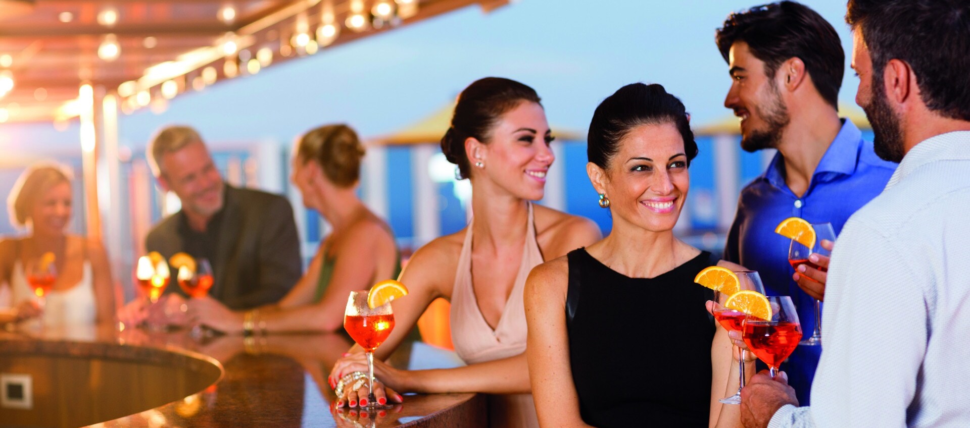 Aperitívy a vermuty, medzinárodné čapované pivá, rozlievané vína biele, ružové a červené, grappa, koňak, whisky, gin, vodka, rum, brandy, tequila, likéry, bylinné horké, ovocné džúsy, rozlievané nealkoholické nápoje a minerálka, teplé nápoje (kávy, čaje, čokoláda), bohatý výber alkoholických a nealkoholických koktailov, miešaných a mrazených nápojov, všetky rozlievané nápoje v reštauráciách a baroch, prvotriedne značkové produkty, prémiové likéry, rozlievané šampanské, nápoje z minibaru v kajute.