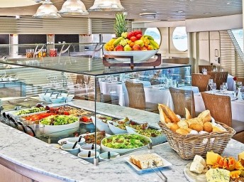 Ubytovanie: Kajuty sú navrhované pre maximálne pohodlie: posteľné prádlo z najlepšej egyptskej bavlny, mramorom vykladaná kúpeľňa, masážne sprchy, kozmetika L’Occitane, zvukový systém SoundDock Bose, televízor, minibar, sušič vlasov, bavlnené papuče a župan. Všetko vyrobené na zakázku pre vaše potešenie. Príjemné pastelové farby, čerstvé kvety vo váze, košík ovocia ...