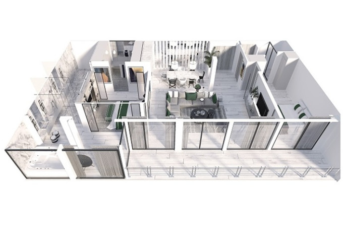 Priestranné Royal Suite disponujú veľkou obývacou a jedálenskou časťou s celoplošnými panoramatickými oknami; zatiaľ čo spálňa má výhľad aj na verandu.