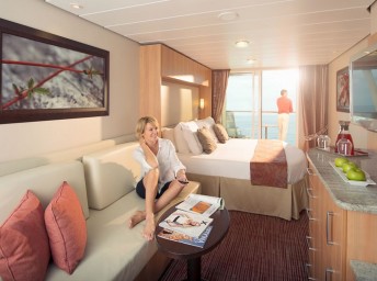 - Kajuty sú umiestnené v blízkosti lodného Spa. K ich vybaveniu patrí posilnený systém vzdušnej filtrácie, posteľ Queen-Size (v kategóriách Edge King-Size), veľké zasúvacie sklenené dvere, exkluzívne posteľné prádlo eXhale®, veľkorysé skladovacie priestory.