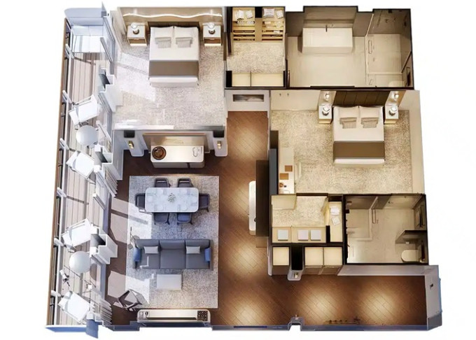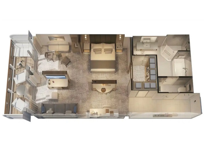 S0 - Signature Sky Suite 117 m² (vrátane 14 m² balkónu). 16. paluba vzadu. Max 5 osôb, Výhody Signature Suite. 22 726 € 11 363 € za osobu