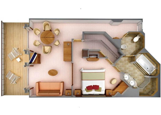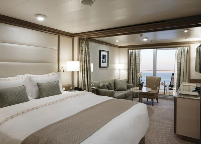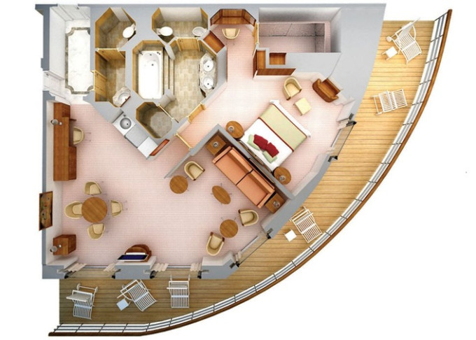 | R1 - Royal Suite 1 92 m² (vrátane balkóna 12 m²), Spálňa s obývacou a jedálenskou časťou. 7. paluba vpredu. Max 3 osoby. | 55 500 € 18 500 € za osobu |